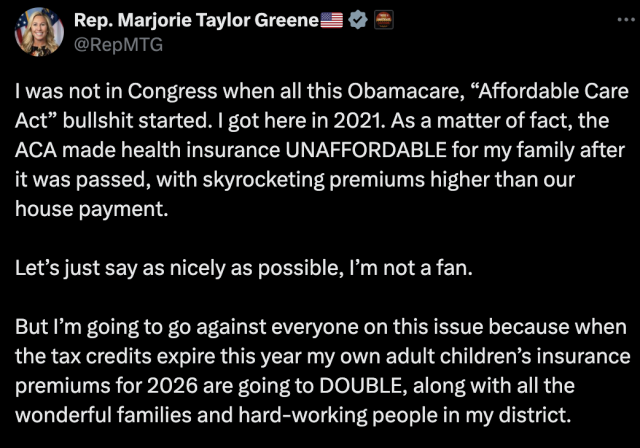I'll give MTG credit for being an attentive mom. Her concern spiked when her children were about to have their out-of-pocket healthcare expenses skyrocket. Her response is about as unhinged as anything else she's said over her years in Congress. The "keep the subsidies" piece is the saving grace, and, as befits our social media age, the only piece people are talking about.
