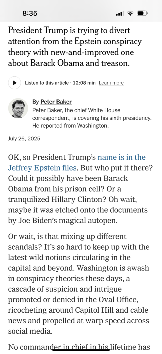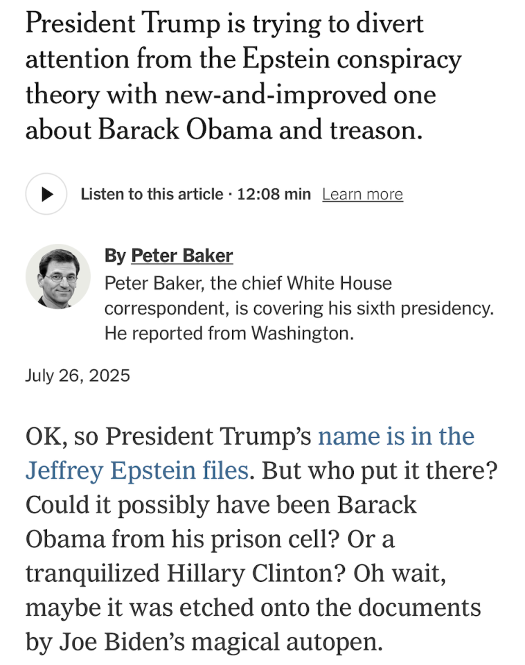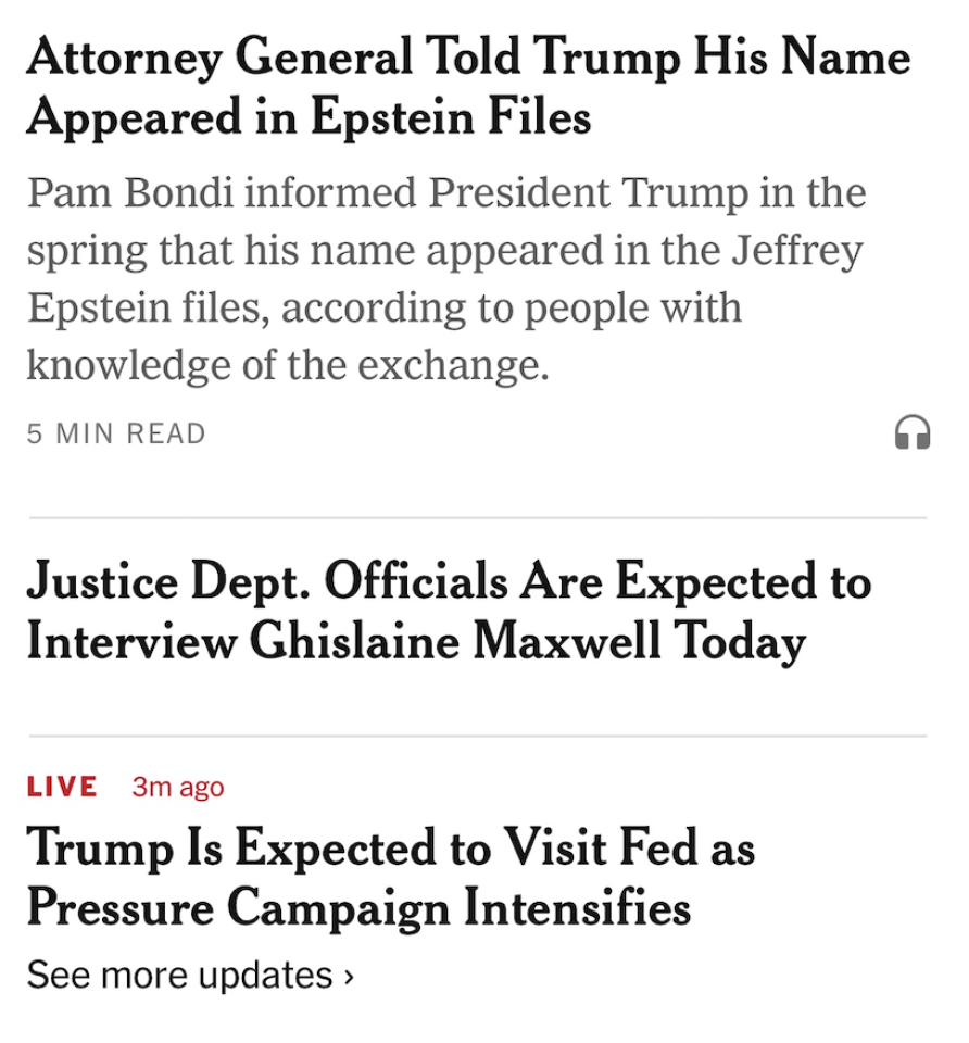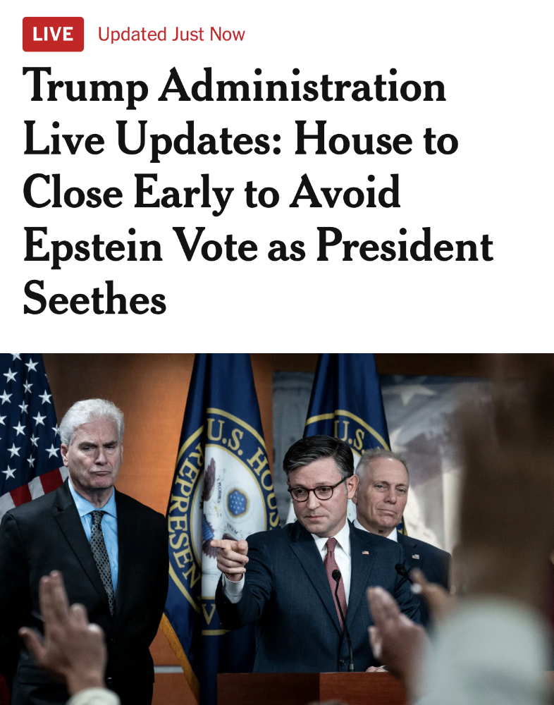 Congress obtains some Epstein material from his estate. In it, they find a homemade birthday greeting from Trump to Epstein, previously described by the Wall Street Journal. Trump had denied that the greeting existed and filed a $10B lawsuit against the WSJ in response to the story. Trump has doubled down, claiming the greeting, found in a bound volume, is a fake.